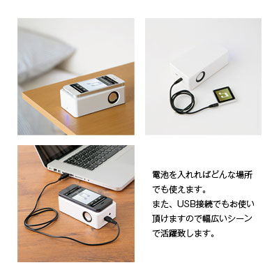 ワイヤレスで使えるスピーカーです。電池もUSBも使えるので色々なシーンでお使い頂けます。